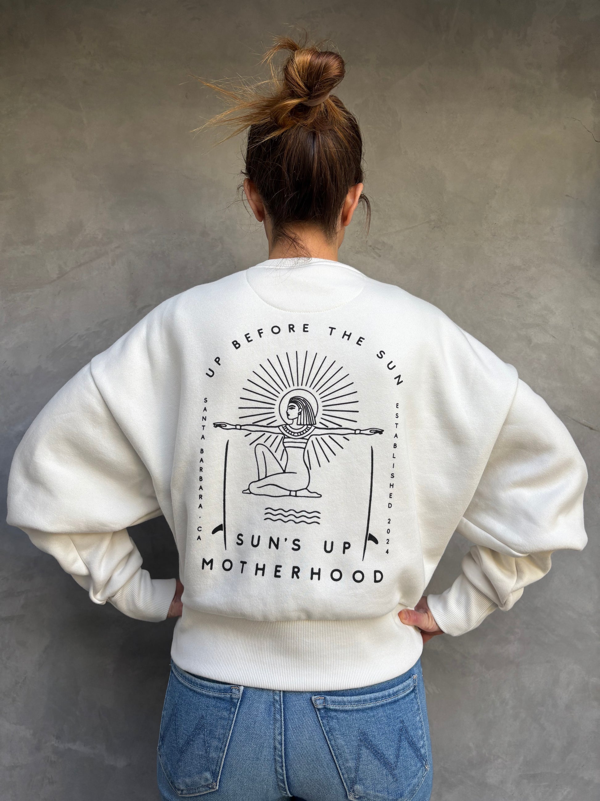 - Our signature sweatshirt is screen printed with our custom design on the back and logo on the left sleeve. Printed in California.
